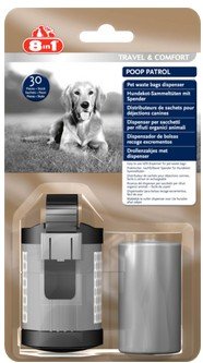 - Pojemnik na odchody dla psa Poop Patrol Dispenser & Pet Waste Bags zapewnia łatwe wyciąganie pojedynczych torebek i jest zaopatrzony w regulowany pasek gumowy, którym można przypiąć go do smyczy.