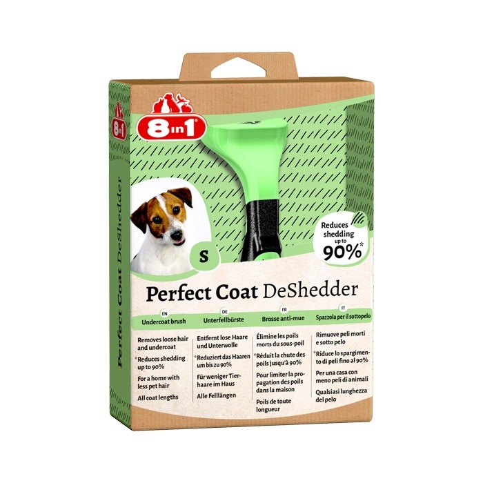 8in1 Perfect Coat DeShedder Dog S to wygodne i odpowiednio dostosowane do wielkości zwierzęcia zgrzebło, które wyczesuje martwy włos, ale przy tym nie wyrywa zdrowej sierści. Zgrzebło przeznaczone jest dla psów posiadających zarówno krótką jak i długą sierść. Produkt jest bardzo pomocny jest w okresie linienia, kiedy zwierzę gubi najwięcej sierści. Przy regularnym wyczesywaniu psa jesteśmy w stanie ograniczyć linienie do 90 %. Przy stosowaniu zgrzebła, należy zwrócić uwagę czy pies posiada podszerstek bądź ma problemy dermatologiczne – w przypadku braku podszerstka lub problemów dermatologicznych należy unikać wyczesywania zwierząt. Zgrzebło można stosować u wszystkich dorosłych oraz młodych psów, które mają za sobą pierwszy okres linienia.