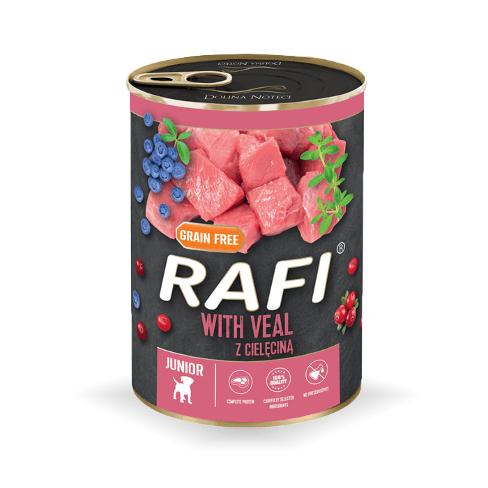 Rafi Junior z cielęciną 400g pełnowartościowa karma stworzona na bazie świeżych, zdrowych mięs, owoców bogatych w witaminy oraz ziół. To niecodzienne połączenie mięsa i owoców, któremu nie oprze się nawet najbardziej wybredny psi smakosz. Mięsa zawarte w karmie zawierają pełnowartościowe oraz lekkostrawne białko, które jest niezbędne do prawidłowego rozwoju oraz wzrostu szczeniąt oraz młodych psów. Karma wyróżnia się składem najwyższej jakości, dzięki któremu dostarczamy psu niezbędnych witamin, minerałów, tłuszczy oraz białek. Borówka Amerykańska i Żurawina zawarte w karmie wykazują silne działania przeciwzapalne oraz przeciwutleniające. Olej z łososia, który jest źródłem nienasyconych kwasów tłuszczowych n-3 i n-6 – wzmacnia sierść i skórę psa, poprawia funkcjonowanie układu trawiennego oraz wspiera naturalną odporność psa. Dodatek do karmy w postaci Tymianku stymuluje wydzielanie soków trawiennych, a dodatkowo dodaje karmie wyrazistego smaku .Karma nie zawiera zbóż, które wykazują bardzo silnie właściwości alergizujące oraz zapychające psa, co bardzo negatywnie wpływa na zdrowie oraz rozwój zwierzęcia.