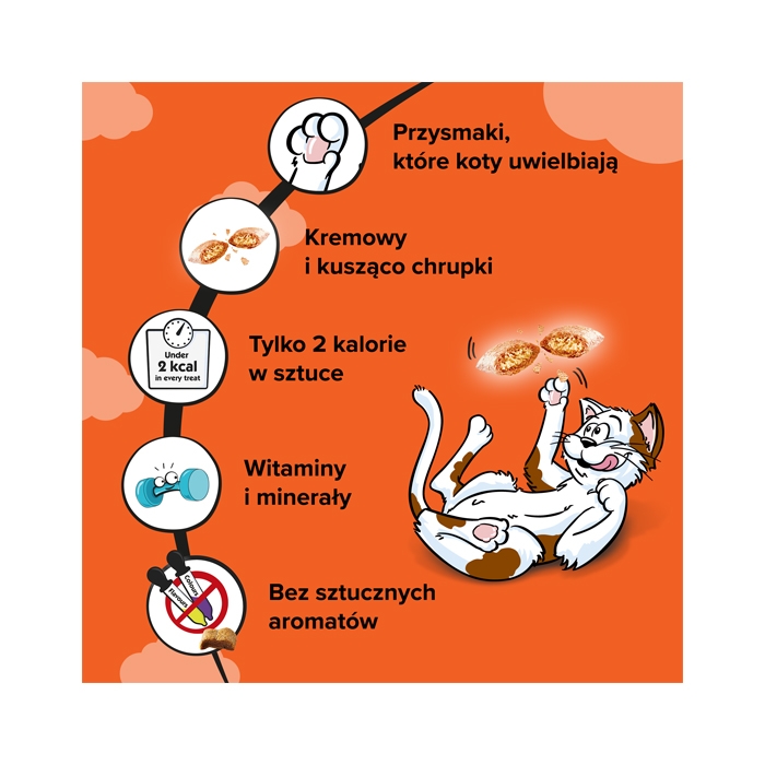 Dreamies to pysznie chrupiące przysmaki z kremowym nadzieniem stworzone specjalnie z myślą o kotach. Wyjątkowo apetyczny smak, chrupiąca skorupka i miękkie nadzienie sprawiają, że koty szaleją za tym przysmakiem.