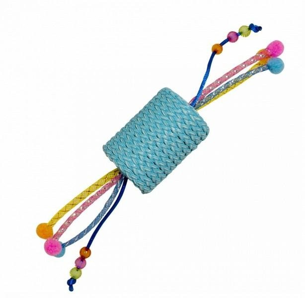 Przyciągająca uwagę rolka wykonana ze skórzanego sznurka, i zakończona kolorowymi strunami.