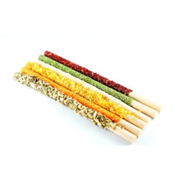 6 gałązek z posypką w różnych smakach: marchewkową, pasternakową, hibiskusową, jeżówkową, nagietkową raz pietruszkową.