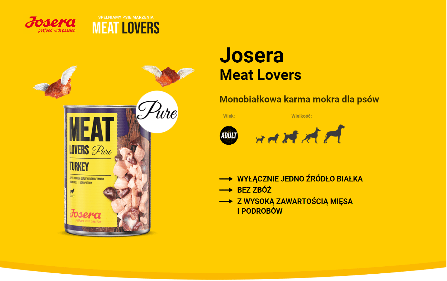 Mokra karma bezzbożowa dla psów wszystkich ras od Josera to zupełna nowość. Josera od lat słynie z produkcji wysokiej jakości, pełno wartościowych karm suchych dla psów i kotów. Teraz przyszedł czas na mokre karmy. Seria Meat Lovers Pure to jak sama nazwa wskazuje karmy mokre dla miłośników mięsa. Każdy pies niezależnie od wieku,. Rasy potrzebuje białka w swojej diecie. Białko jest budulcem, pomaga w wielu procesach metabolicznych, a dodatkowo dodaje cennej energii. Dodatkowo jakby nie patrzeć, ale psy mają organizm przystosowany do trawienia mięsa. Silnie działające kwasy żołądkowe, które są w stanie poradzić sobie z kośćmi, ostre zęby, do rozrywania i miażdzenia kości. A do tego wszystkiego charakterystyczny dla wszystkich mięsożerców krótki przewód pokarmowy. Pies powinien jeść mięso i to nie ulega wątpliwości. Karmy zbożowe są dobrym źródłem energii i substancji balastowych.