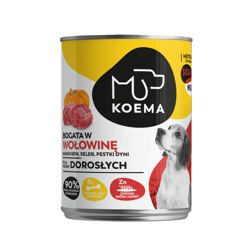 Karma w puszce Koema to produkt, który dobrze komponuje się także z przygotowanymi samodzielnie przez opiekuna czworonoga posiłkami, na bazie mięsa i wybranych warzyw