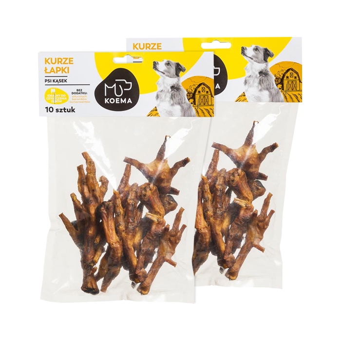 Koema kurze łapki to w pełni naturalny gryzak, przeznaczony dla psów w każdym wieku oraz każdej rasy. Naturalny oraz zdrowy gryzak w postaci kurzych łapek występuje w małym rozmiarze oraz polecany jest szczególnie ze względu na wsparcie w czyszczeniu zębów, ponieważ psy gryząc, ścierają kamień nazębny, dbając przy tym o higienę jamy ustnej.