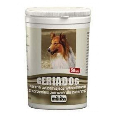 Preparat Mikita Geriadog przeznaczony jest dla starszych zwierząt, osłabionych. Jest też świetnym uzupełnieniem dla psów młodych w okresie wzmożonego wysiłku psychicznego. Zawarte w preparacie witaminy wzmacniają i ochraniają metabolizm organizmu. Drożdże piwne stanowią źródło łatwo przyswajalnych aminokwasów, węglowodanów, naturalnych witamin. Korzeń żeń-szenia przeciwdziała znużeniu, zmęczeniu. Skojarzone działanie wszystkich składników łagodzi objawy związane ze starością (osowiałość, niechęć do ruchu, osłabiony odbiór bodźców zewnętrznych). Podając ten preparat dbasz o godną starość swojego przyjaciela.
