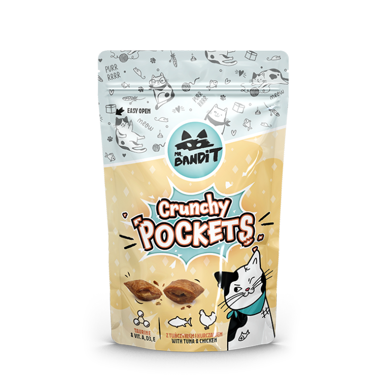 Mr. Bandit Crunchy Pockets to chrupiące, mięsne poduszeczki dla kocich łasuchów. Kruche i wzbogacone tauryną ciasteczka zachęcają do łobuzowania!