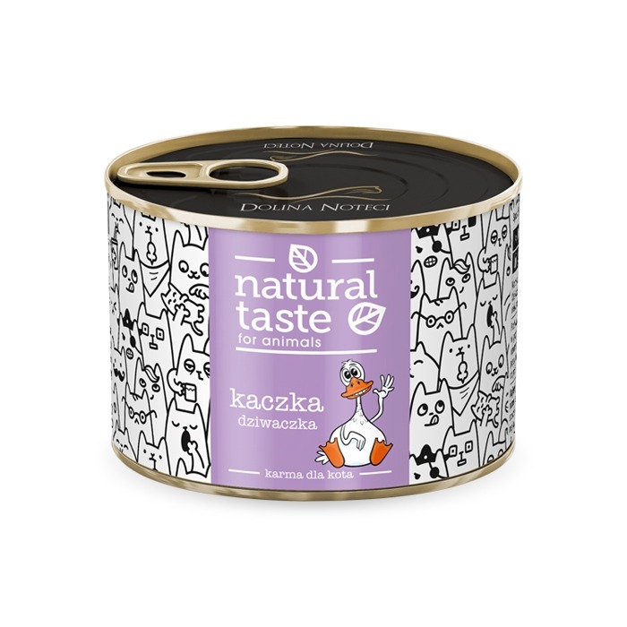 - Karma dla kota Natural Taste Kaczka Dziwaczka dzięki wysokiej zawartości kaczki i kurczaka jest źródłem lekkostrawnego białka bogatego we wszystkie aminokwasy egzogenne. Mimo iż jest to produkt niskotłuszczowy, zawiera odpowiedni poziom kwasu arachidonowego niezbędnego do utrzymania prawidłowego funkcjonowania organizmu dorosłego kota.
