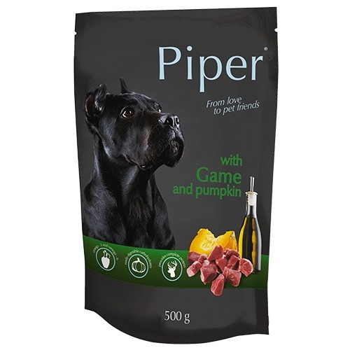 Mokra karma dla psów Piper to odpowiedź na potrzeby dietetyczne współczesnego psa. Nie zawiera ona żadnych składników dodatkowych, jest bogata w mięso oraz pozbawiona jakich kol wiek zbóż- dzięki temu jest odpowiednim pożywieniem dla psów z alergią pokarmową. Zboża utrudniają wchłanianie składników oraz mogą wywoływać alergię, obciążają układ trawienny. Dzięki zamianie w karmie Piper ciężkostrawnych zbóż na warzywa i owoce – pies ma zapewnione doskonałe i spokojne trawienie. Dodatkowo karma zawiera wiele nienasyconych tłuszczów, które dbają o prawidłową pracę serca, mózgu oraz o lśniącą i zdrową sierść.