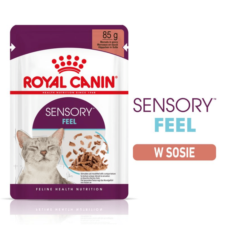 Karma mokra dla kotów dorosłych, pobudzająca zmysły smaku Royal Canin Feel To specjalnie skomponowany posiłek przez specjalistów i doradców żywieniowych firmy Royal Canin. Karma mokra dla kota Royal Canin Sensory Feel w sosie, opracowana w taki sposób aby zadbać o zmysły kota. Dodatkowo karma mokra wspiera zdrowie zwierzaka, dzięki odpowiednim składnikom odżywczym, które wspomagają zdrowie układu moczowego kota.
