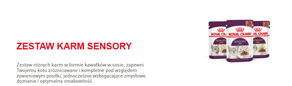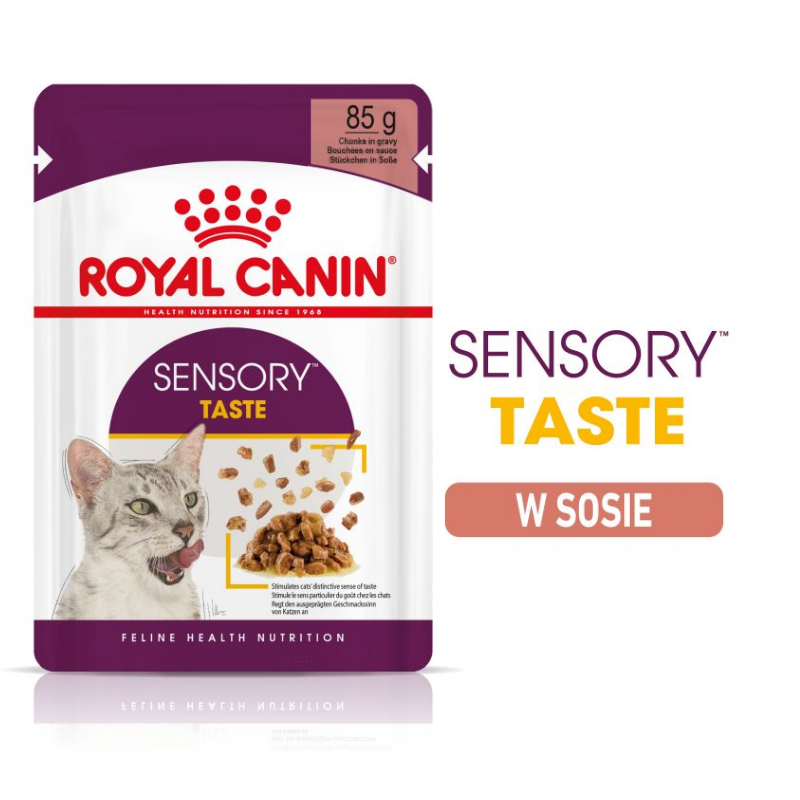 AnaKate5ROYAL CANIN Sensory w kartonowym opakowaniu zbiorczym to doskonały produkt dla osób posiadających wybredne koty. Ten zestaw mokrej karmy (kąski z sosem) występuje w 3 wersjach stymulujących zmysły. Pozwala nie tylko urozmaicić jedzenie kota, ale i przetestować, który ze smaków bardziej odpowiada zwierzakowi. Dzięki temu można dokupić dodatkowo dostępne także w pojedynczych smakach opakowania przypadające kotu do gustu. Wspieranie układu moczowego w tej serii jest plusem. Saszetki pozwalają łatwo dawkować i wygodnie się otwierają by zachować czystość przy karmieniu. Polecam, bo u mnie Kitty zasmakowała w tej karmie. - 2022-06-17