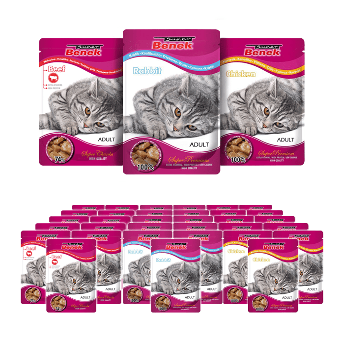 12 x wołowina, 12 x królik, 12 x kurczakSuper Benek Adult w sosie 100g pełnowartościowa mokra karma dla dorosłych kotów wszystkich ras.