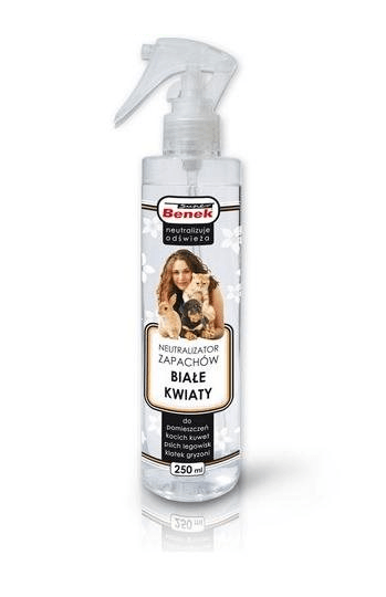 Super Benek neutralizator zapachów białe kwiaty spray to spray neutralizujący brzydkie zapachy o delikatnym zapachu białych kwiatów.