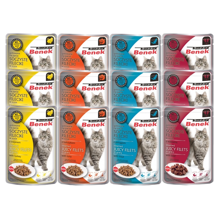 Karma mokra dla kota Super Benek Soczyste Fileciki w sosie MIX 4 smaków 85g x 12