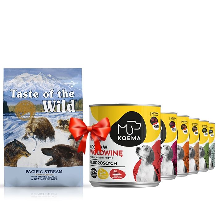 Karma sucha dla psa Taste of the Wild Pacific Stream 12,2kg + Koema 90% mięsa mix 6 smaków 800g x 6