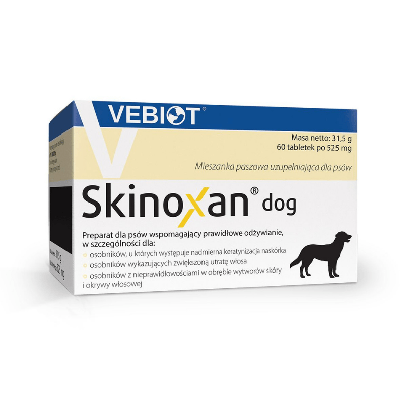 Skinoxan dog to preparat na sierść i skórę dla psów wszystkich ras. Jego udoskonalona formuła pomaga uzupełnić dietę psa w niezbędne witaminy. Polecany zarówno psom dorosłym jak i szczeniakom. Zarówno przy nadmiernym wypadaniu włosa, jak i przy łuszczeniu naskórka, łupieżu, świądu, alergiach, W szczególności dla zwierząt, które objawiają nieprawidłowości w obrębie okrywy włosowej i wytworów skóry. Składniki zawarte w preparacie na sierść Skinoxan dog wykazują działanie wpływające na poprawę kondycji skóry oraz wyglądu sierści, zmniejsza jej matowość i łamliwość.Dlaczego pies ma problemy ze skórą czy sierścią?
