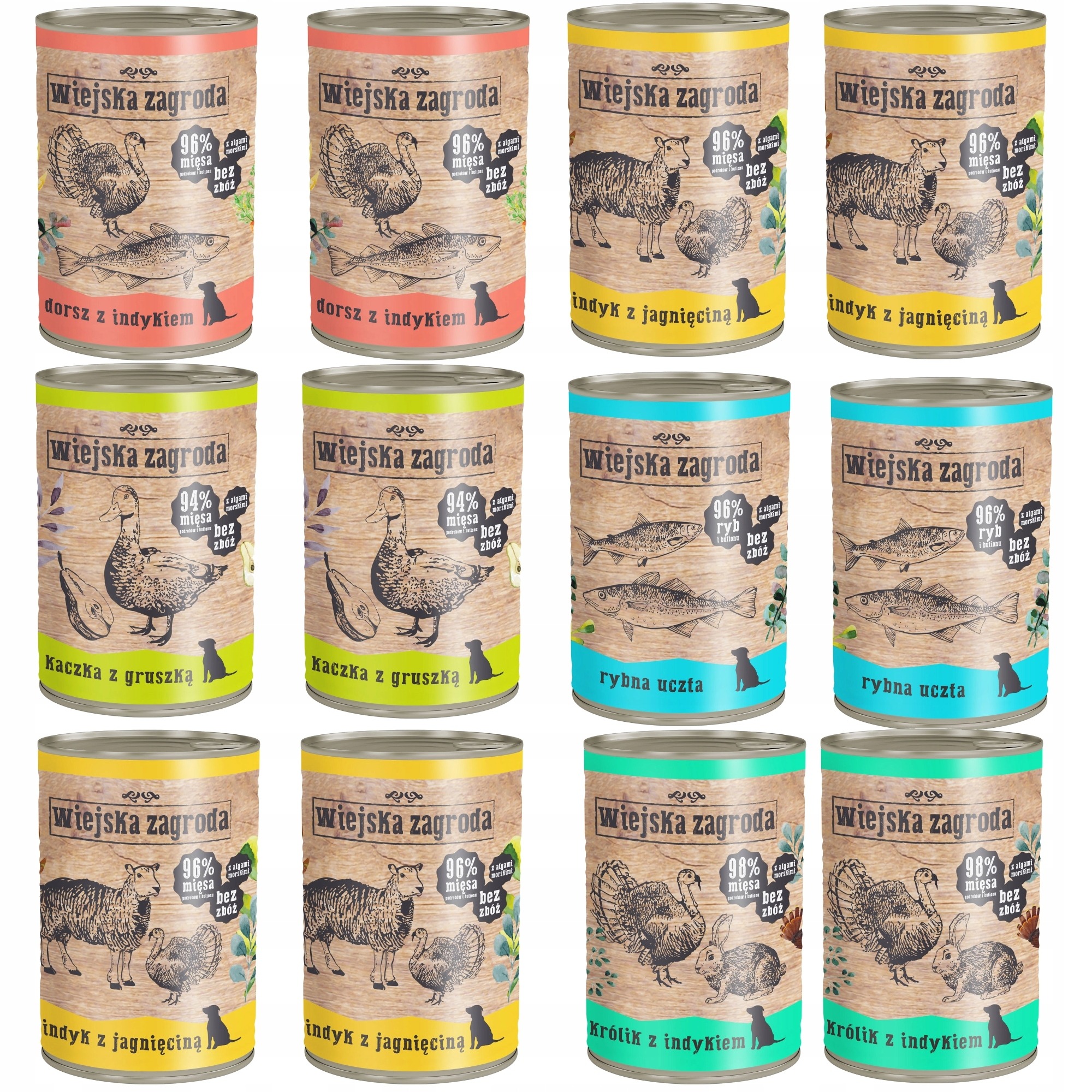 12 x Wiejska Zagroda Indyk z Jagnięciną 400g 6 x Wiejska Zagroda Kaczka z Gruszką 400g 6 x Wiejska Zagroda Dorsz z Indykiem 400g 6 x Wiejska Zagroda Królik z Indykiem 400gKarma mokra dla psa z mięsem Podstawowe cechy produktu Wiejska Zagroda 400g:- Karma mokra dla psa z mięsem